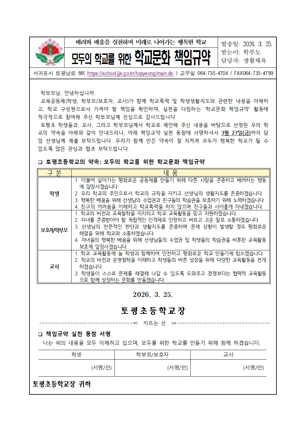 2026학년도 토평초등학교 학교문화 책임규약 안내