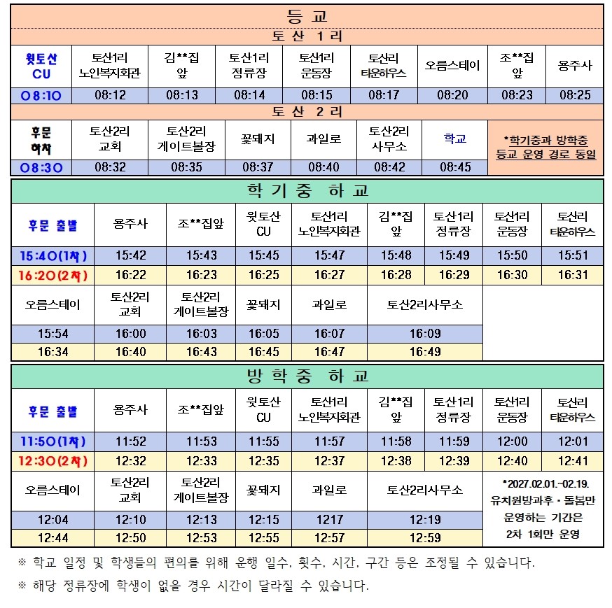 2026학년도 토산초등학교 통학버스 노선 안내