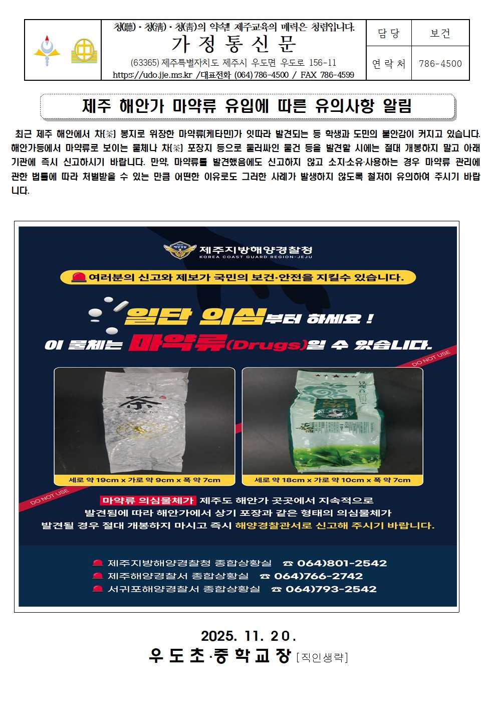 제주 해안가 마약류 유입에 따른 유의사항 알림
