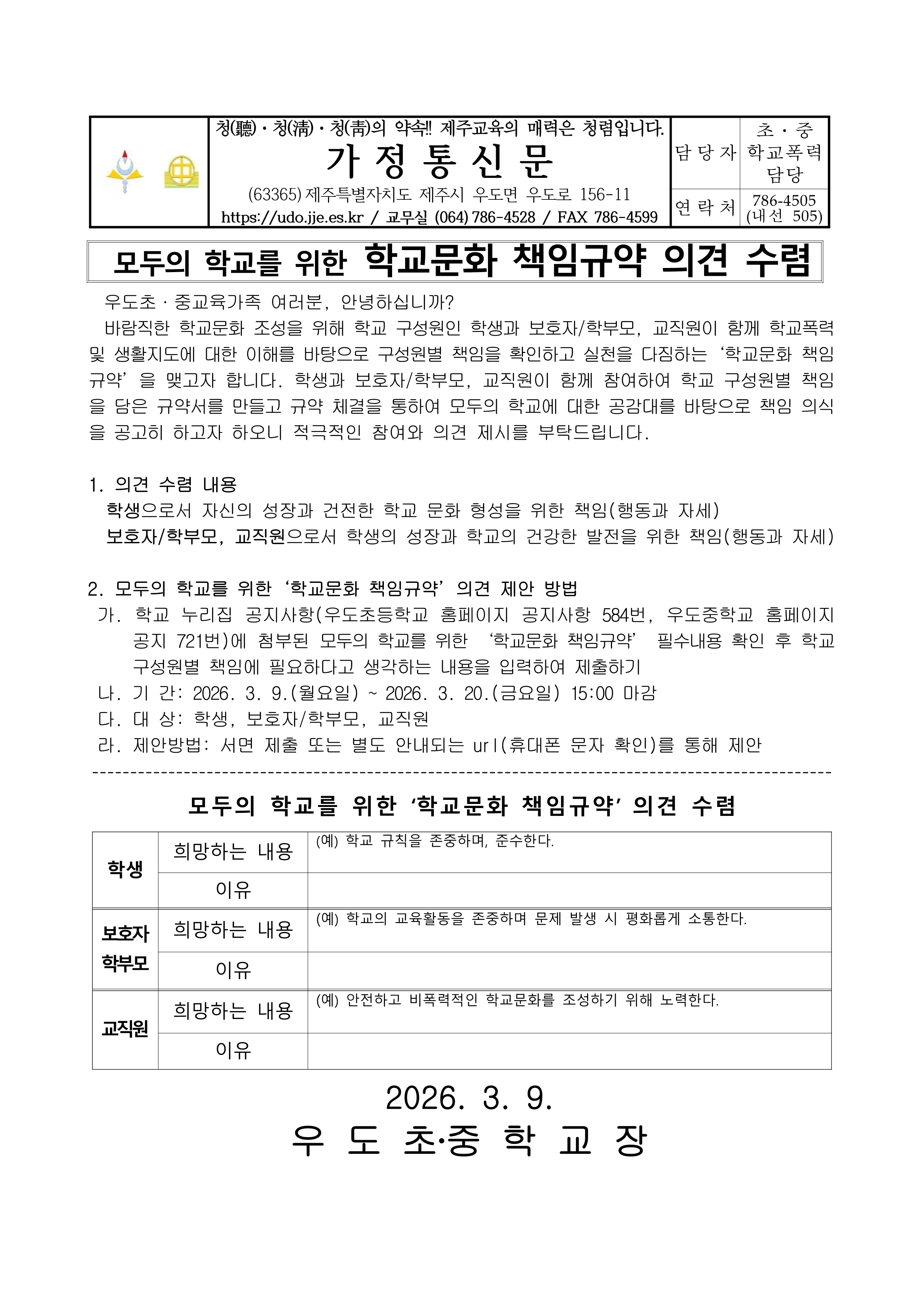 2026학년도 우도중 학교문화 책임규약 의견 수렴