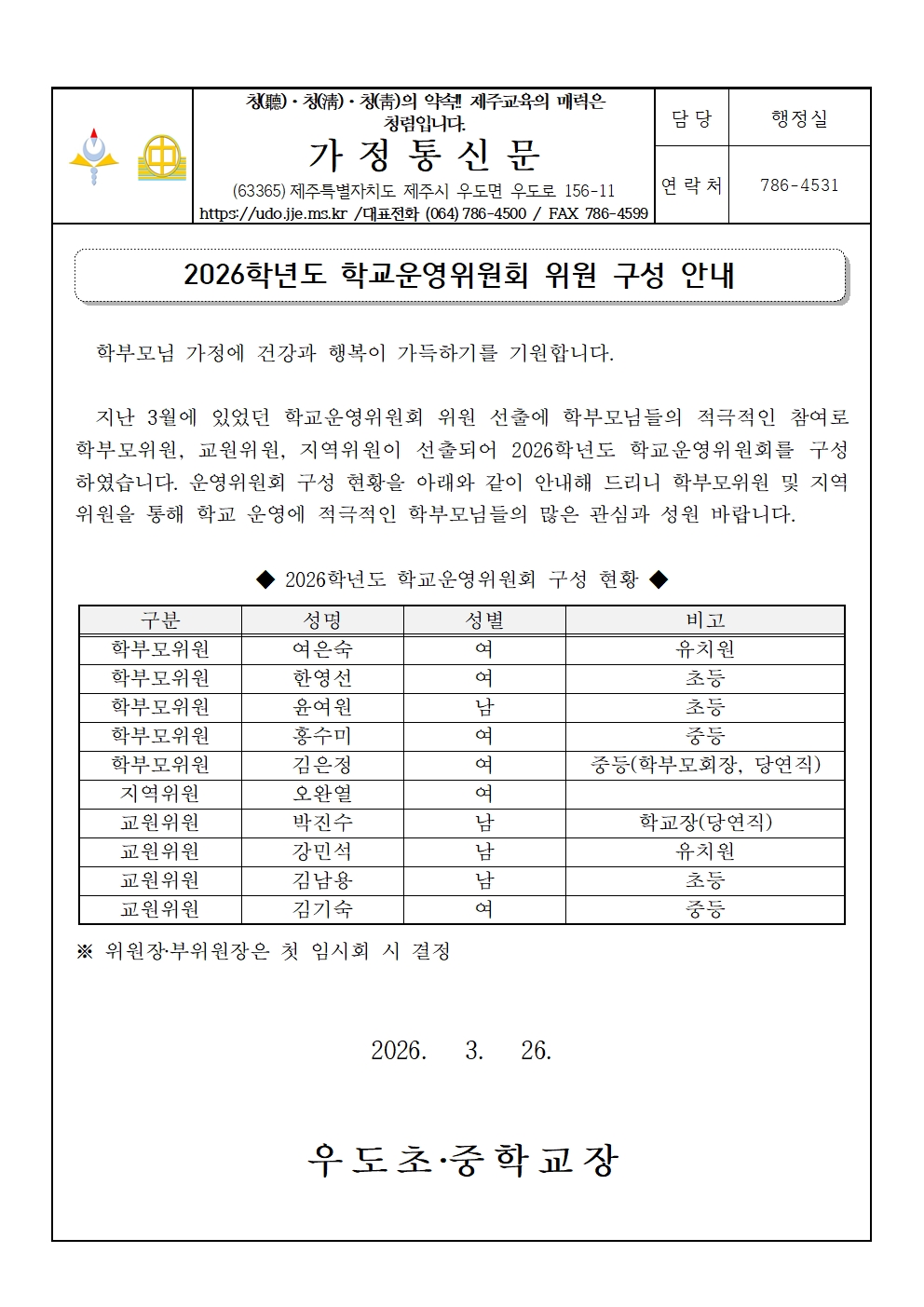 2026학년도 학교운영위원회 위원 구성 안내