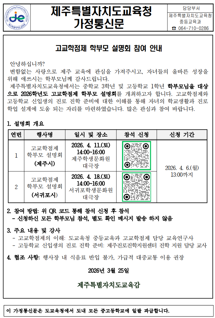 [제주특별자치도교육청 공통 가정통신문] 2026학년도 고교학점제 학부모 설명회 참석 안내