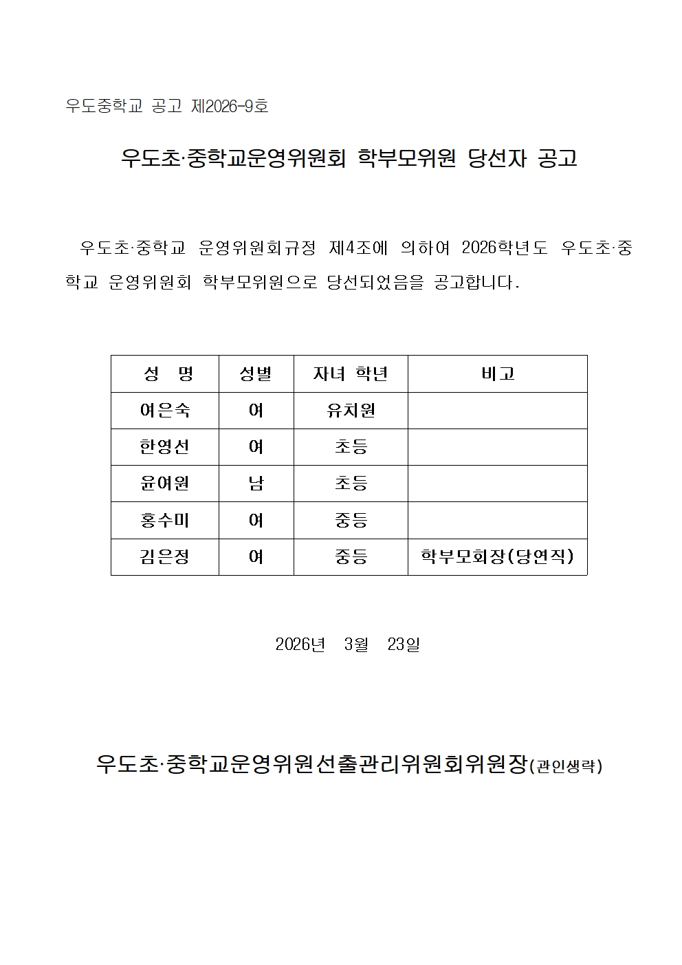 2026학년도 우도초.중학교운영위원회 학부모위원 당선자 공고