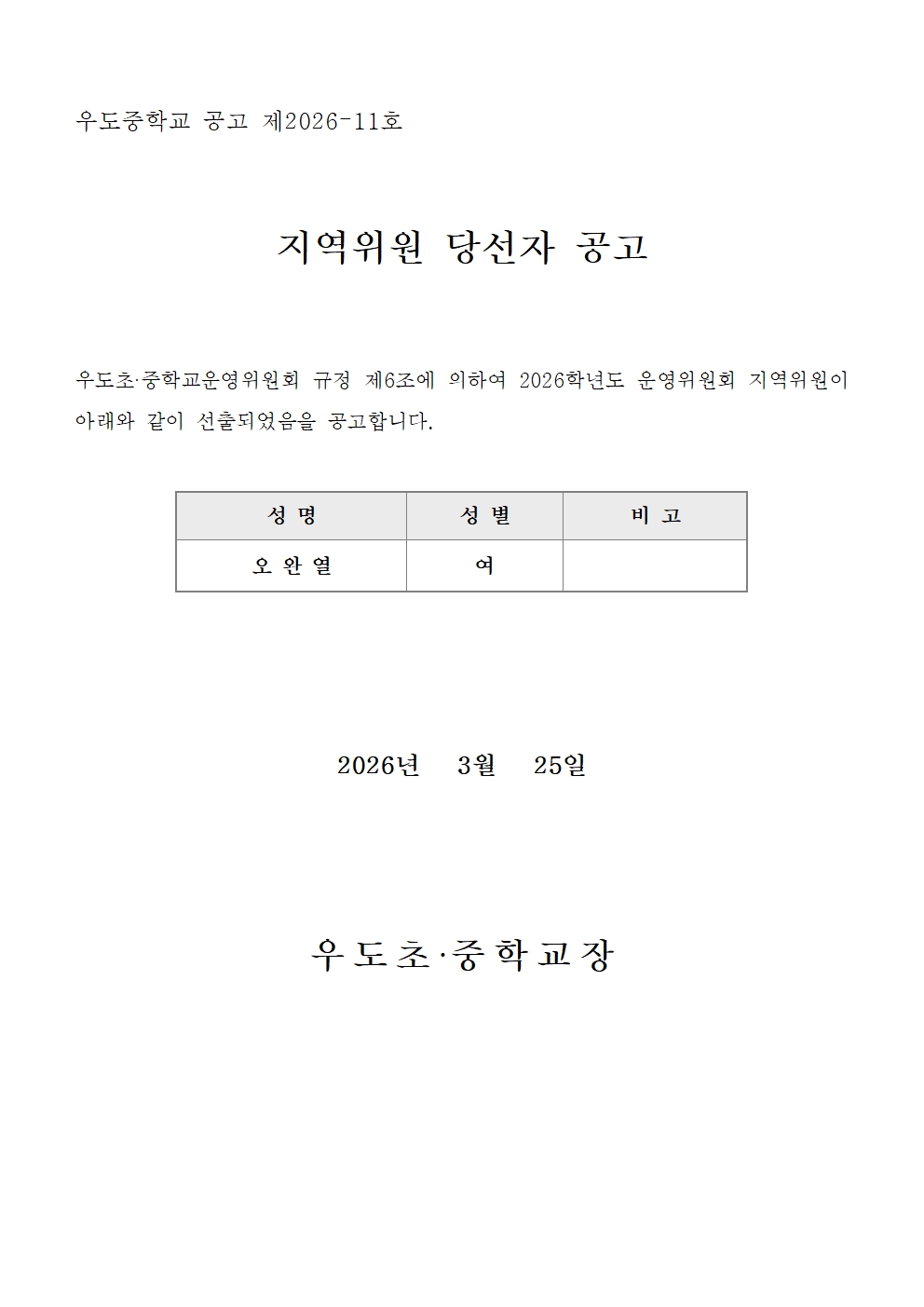 우도초.중학교운영위원회 지역위원 당선자 공고