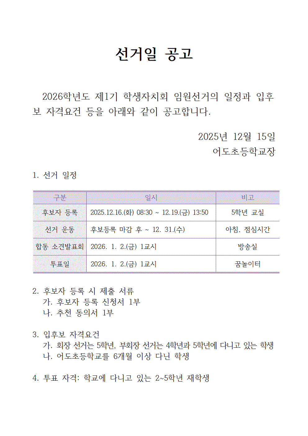 2026학년도 1기 학생자치회 임원선거 선거일 공고