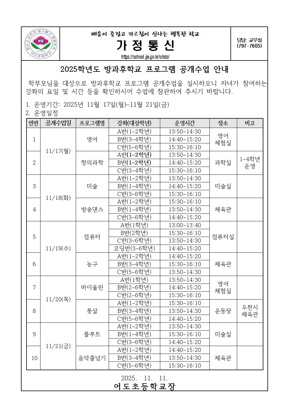 2025학년도 2학기 방과후학교 학부모 공개수업 안내