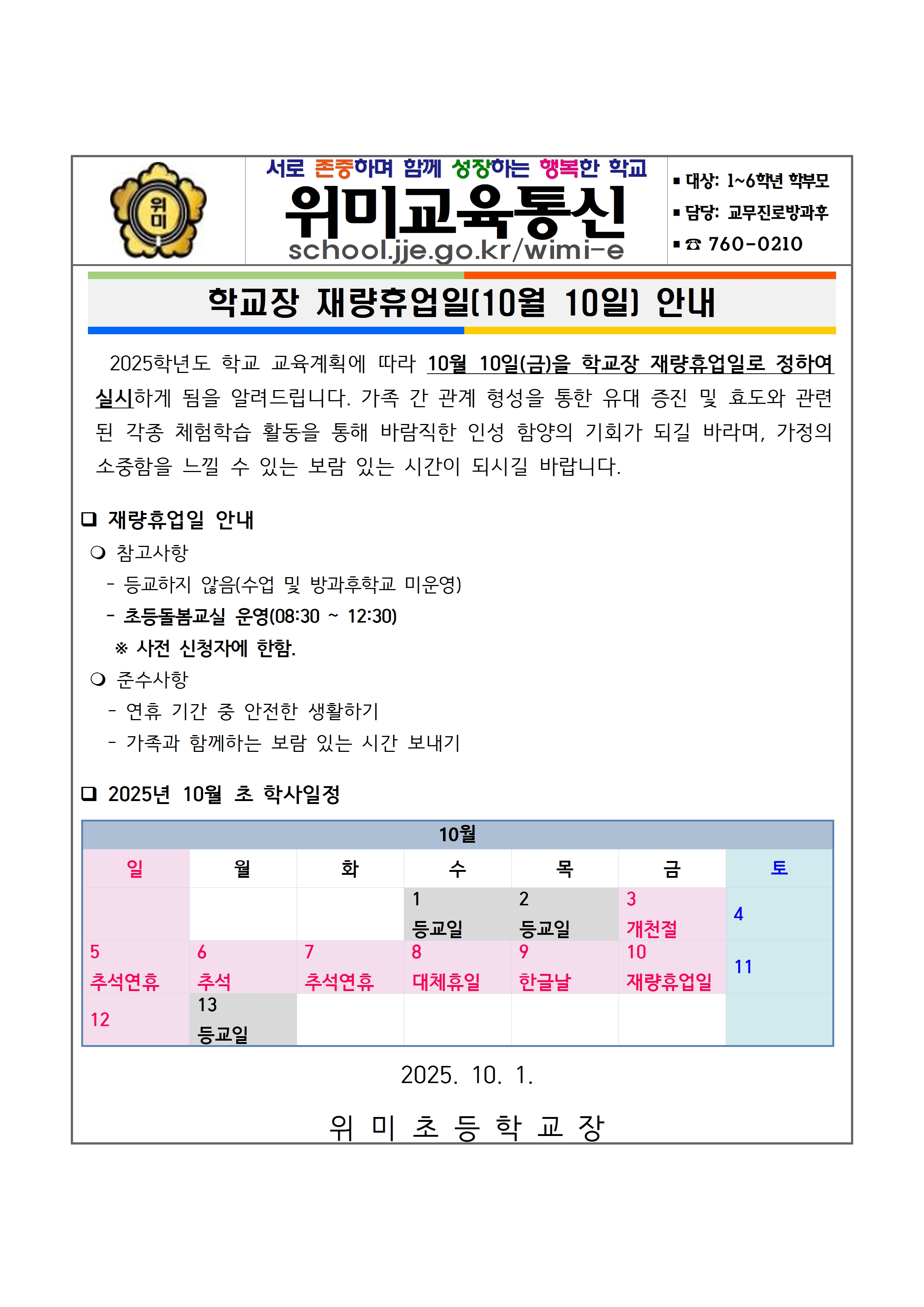 학교장 재량휴업일(10월 10일) 안내