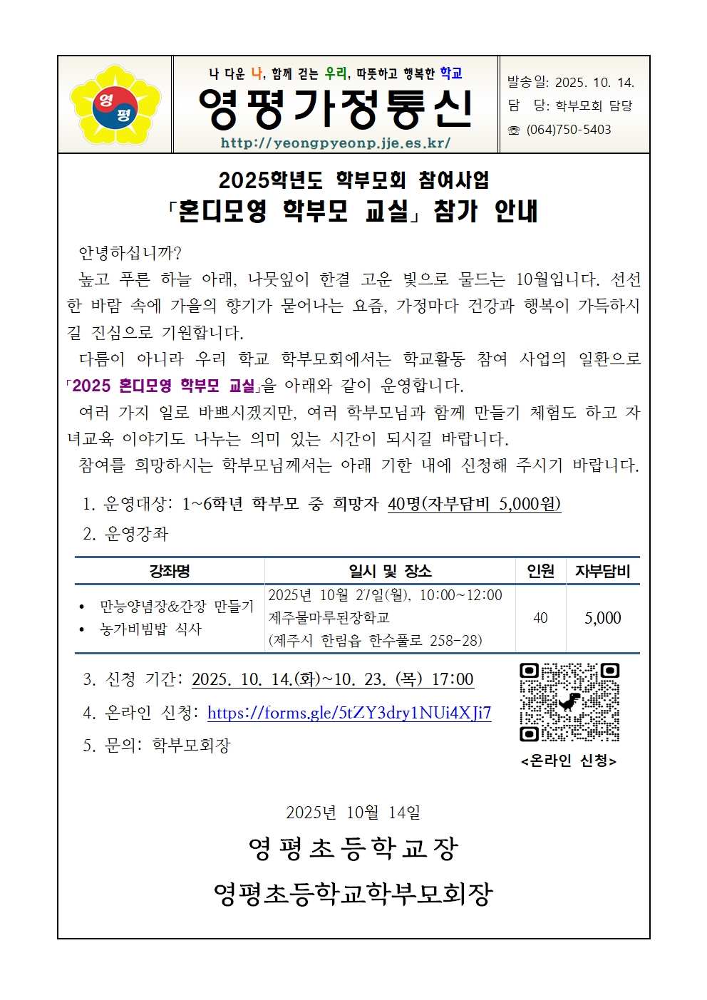 2025학년도 영평 학부모회 참여사업 「혼디모영 학부모 교실」 참가 안내