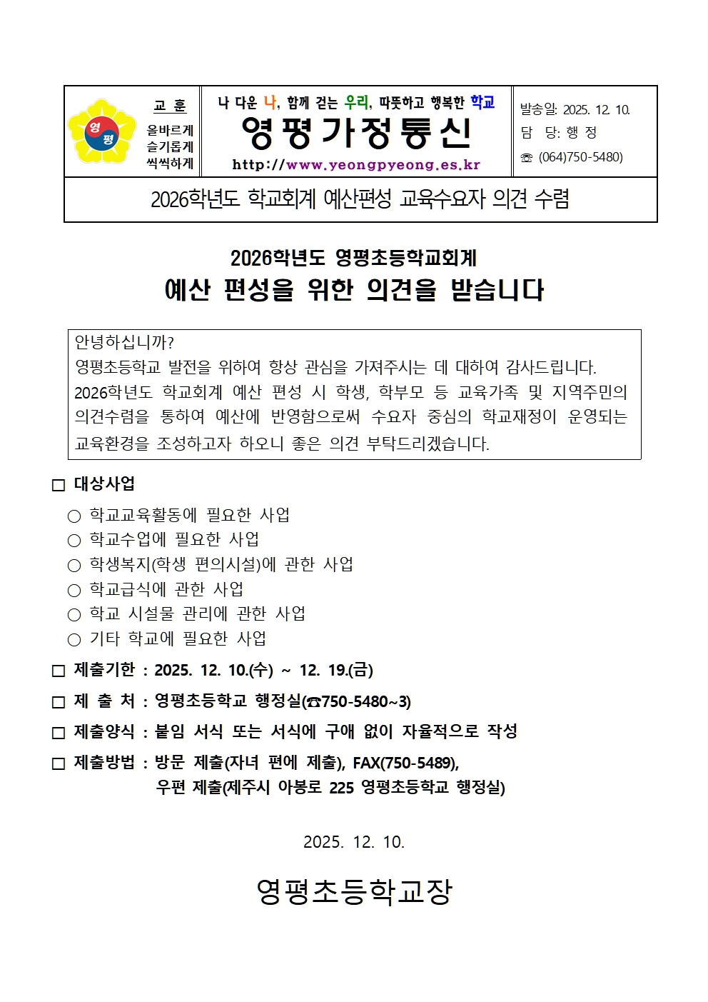 2026학년도 영평초등학교회계 예산편성 교육수요자 의견 수렴