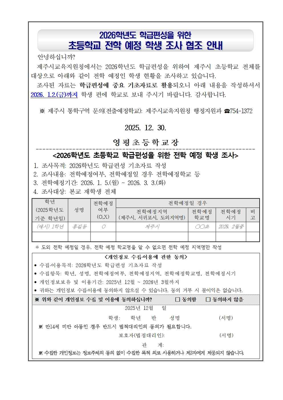 2026학년도 학급편성을 위한 초등학교 전학예정학생 조사 협조 안내