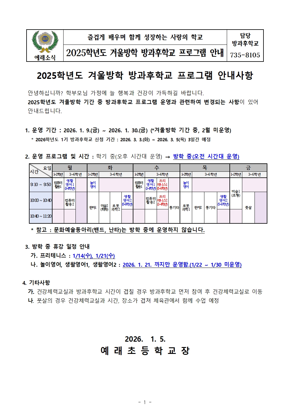 2025학년도 겨울방학 방과후학교 변경사항 안내