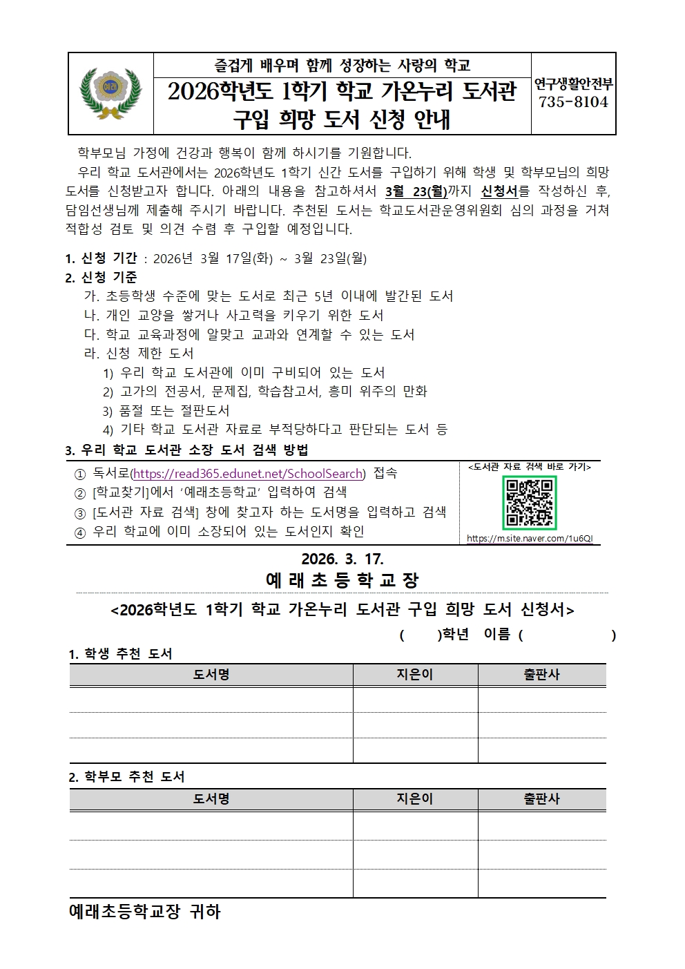 2026학년도 1학기 학교 가온누리 도서관 구입 희망 도서 신청 안내