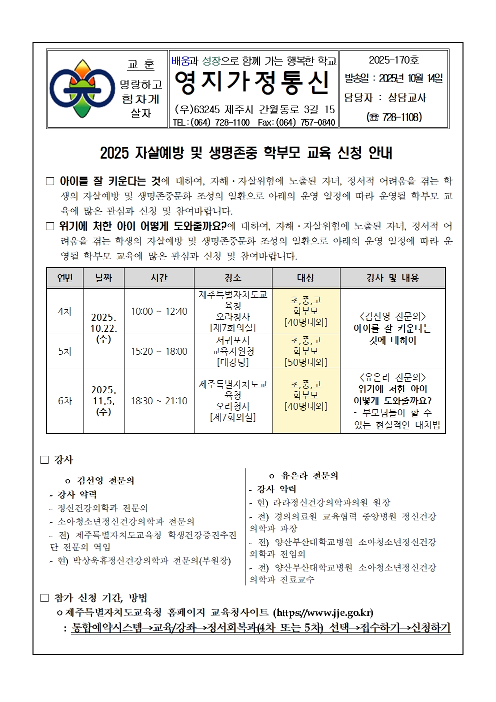 [제주특별자치도교육청 가정통신문] 위기에 처한 아이 어떻게 도와줄까요?_2025 자살예방 및 생명존중 학부모 교육(6차) 신청 안내