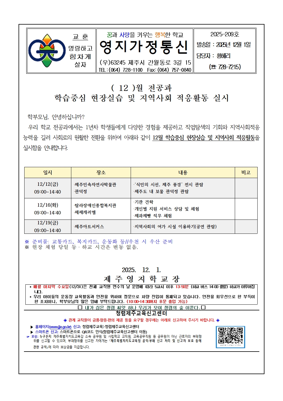 2025학년도 전공과 학습중심 현장실습 및 지역사회 적응활동 가정통신문(12월).hwp